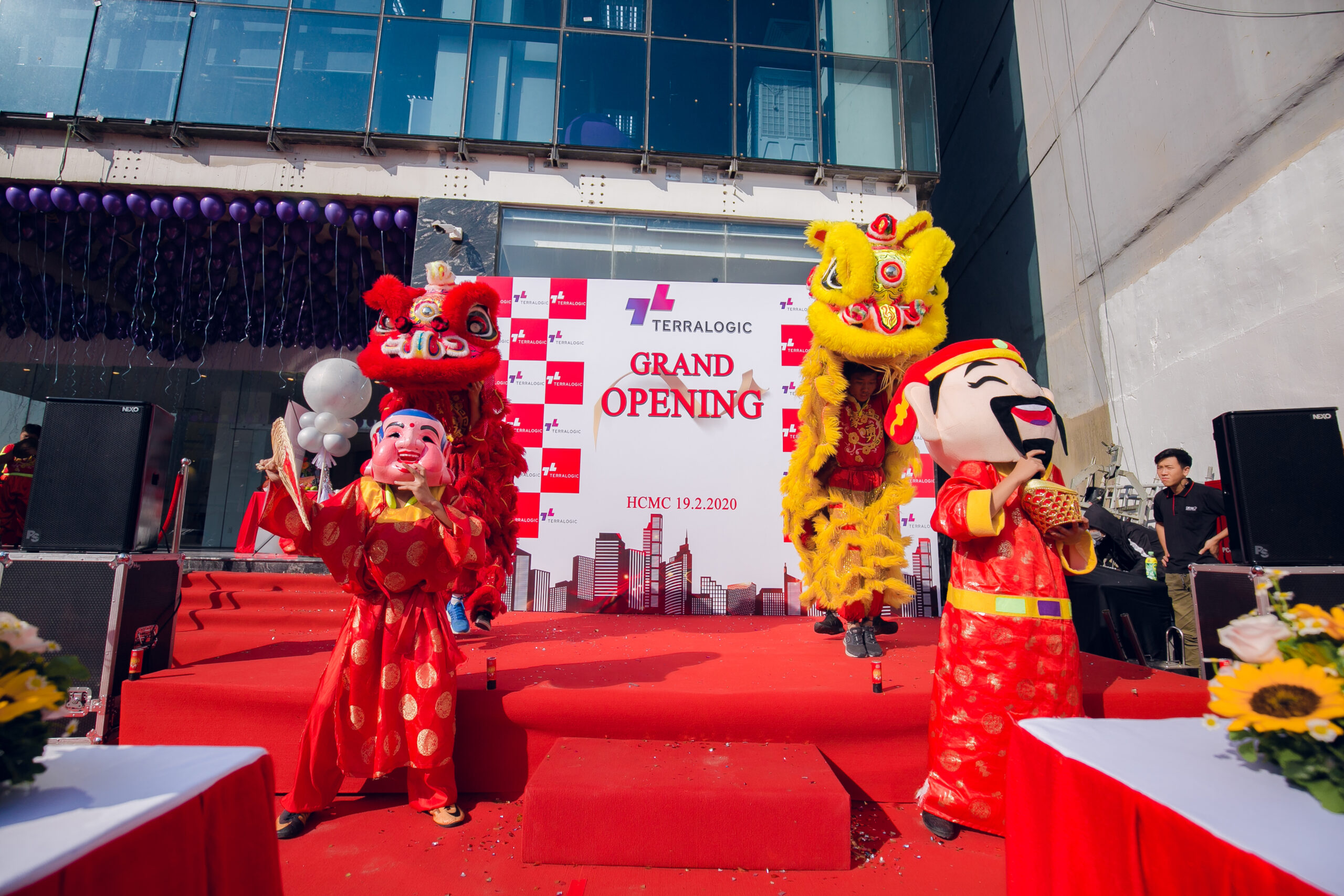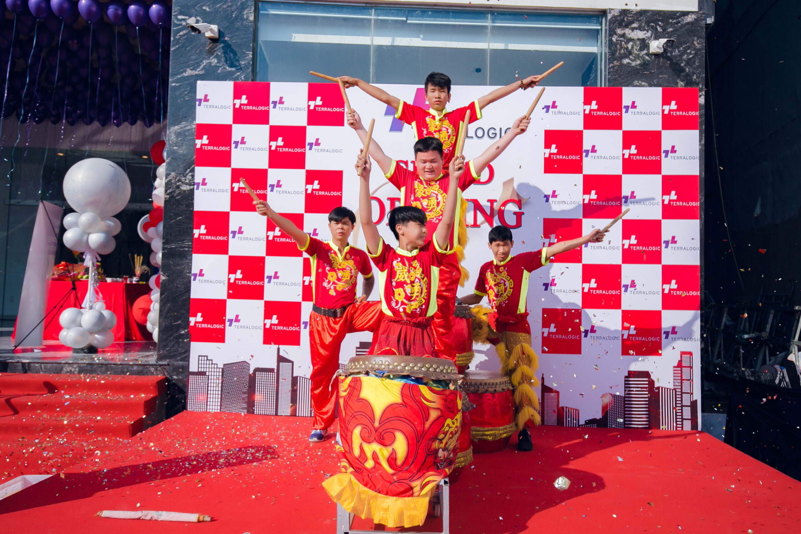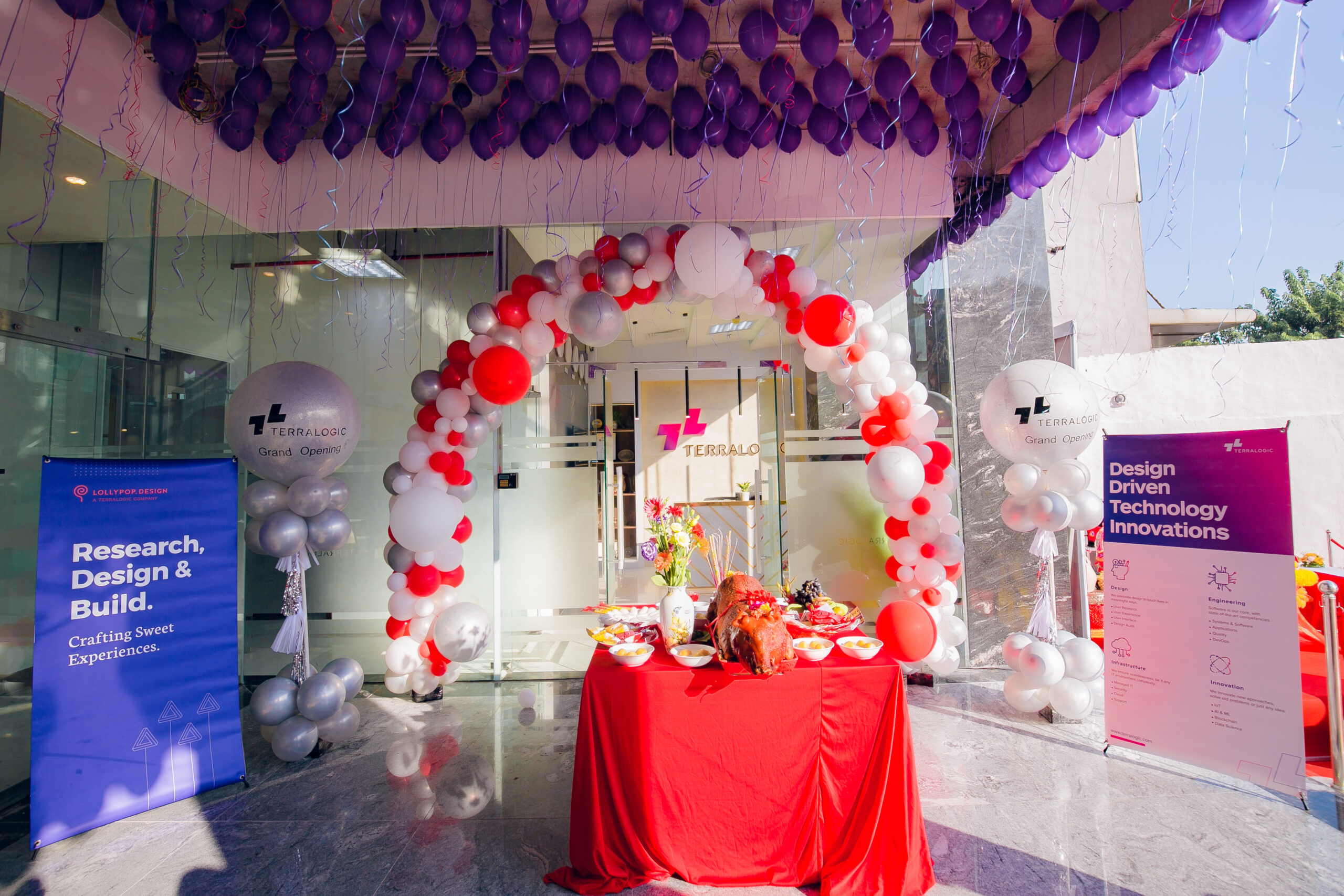 Không gian buổi lễ được trang trí với tông màu đỏ và trắng, toát lên được một bầu không khí sôi nổi, rộn rã của ngày khai trương. Bên cạnh đó xung quanh khu vực văn phòng còn được treo những chiếc bóng bay màu tím. Mang lại cảm giác nhẹ nhàng nhưng không kém phần tinh tế, mạnh mẽ. Đây cũng là màu sắc chủ đạo của Terralogic, đại diện cho sự sáng tạo, năng động và đầy nhiệt huyết.